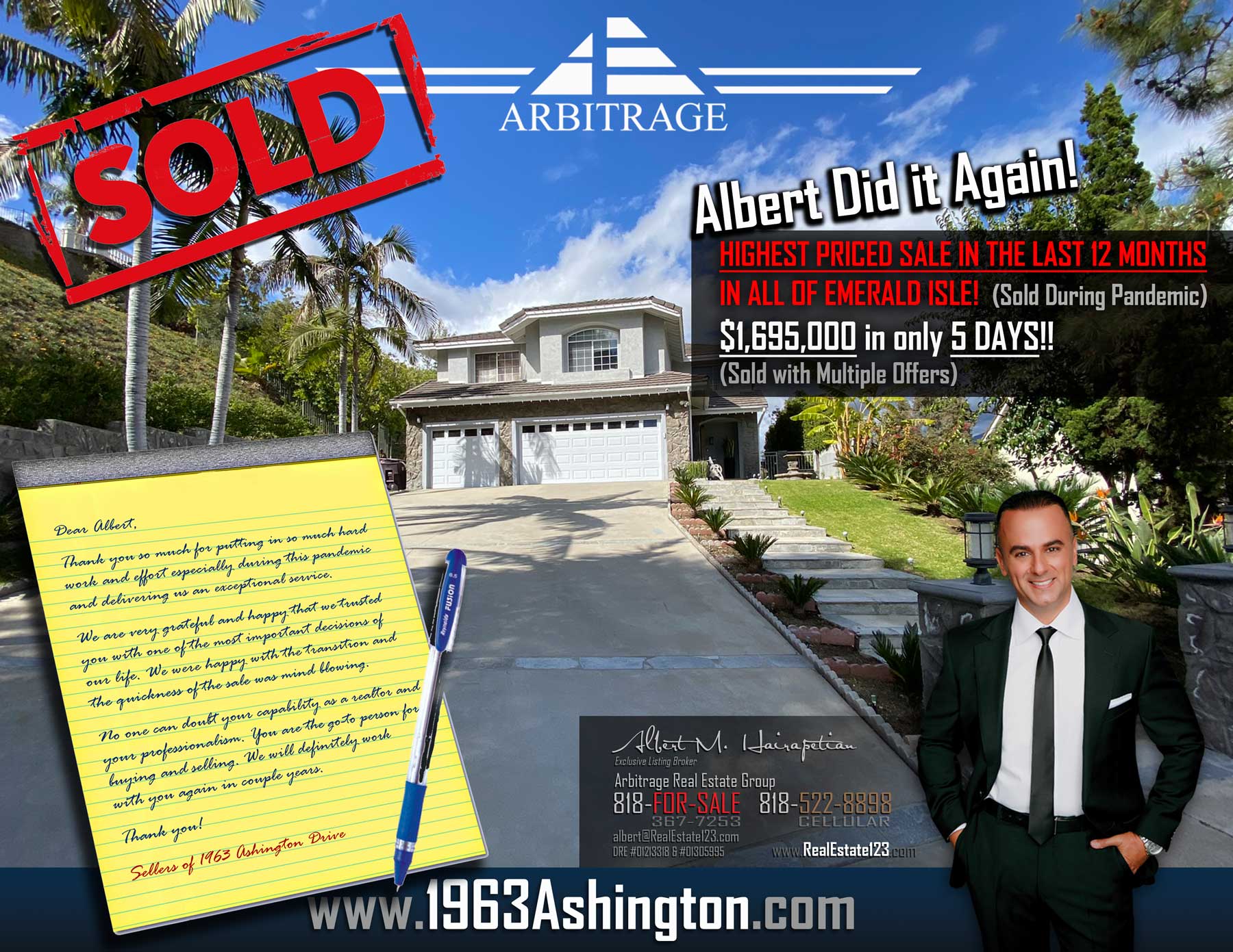 Albert Hairapetian and Arbitrage Real Estate Group are proud to announce another Record Sale. This one happens to be in the Emerald Isle area of Glendale! In fact, this also happens to be the HIGHEST PRICED sale in over 12 months in this entire area. To top if off, Albert was able to successfully find multiple buyers and get this home under contract in only 5 days. Yup, it was all done with masks, gloves and…. you name it!